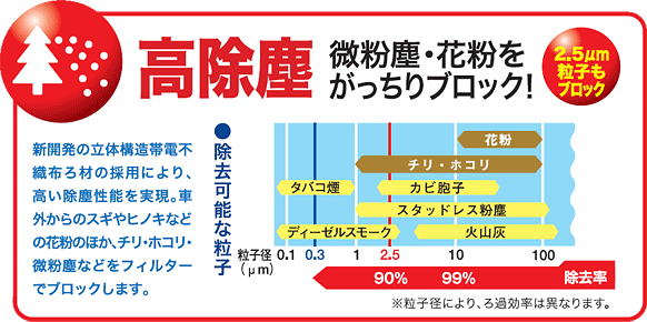 道路上の粉塵や、ホコリ、花粉をがっちりブロック。PM2.5も逃さない!