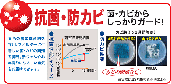 青色の層に抗菌剤を採用。フィルターに付着した菌・カビの繁殖を抑制するため、赤ちゃんやお年寄りにもやさしい空気をお届けできます。