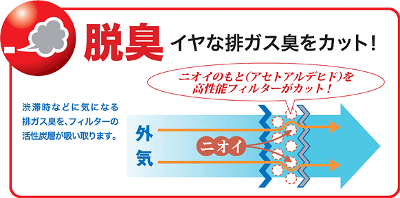 渋滞時などに気になる排ガス臭を、フィルターの活性炭素層が吸い取ります。