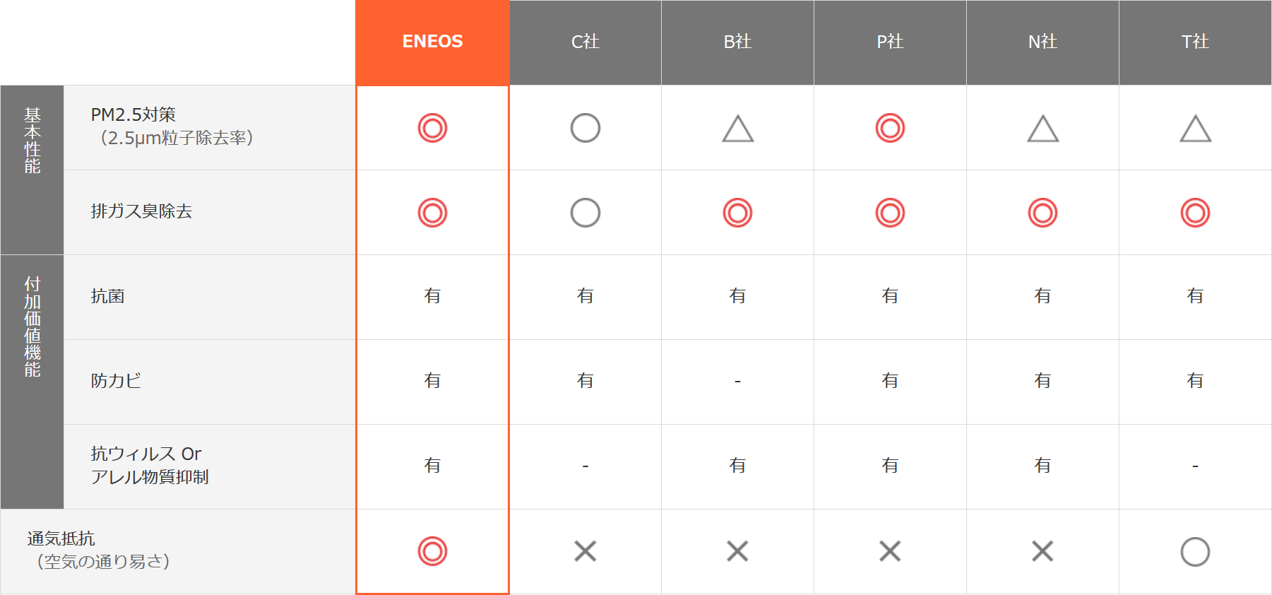 エアコンフィルター高機能脱臭タイプの性能比較 (他社品は代表例)