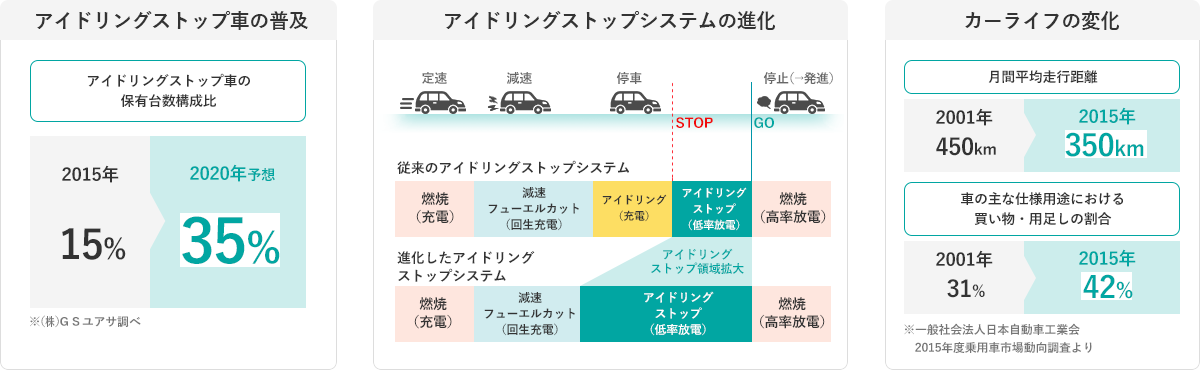 近年の環境意識の高まりにより、アイドリングストップ車の販売台数は飛躍的に増加しています。それに伴って、アイドリングストップシステムは大きく進化。さらに「ちょい乗り」が増えるなど、カーライフも変化しており、高い耐久性能を持つアイドリングストップ車対応バッテリーのニーズが高まっています。