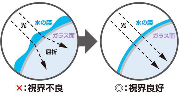 本来ワイパーブレードは、フロントガラスに溜まった水滴を拭き取るのではなく、薄く均一な水の膜を作ることで光の屈折を防ぎ、クリアな視界を確保します。