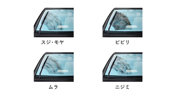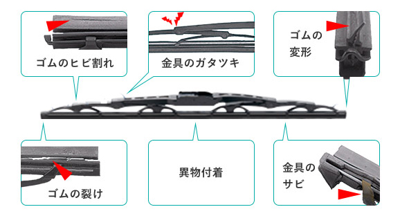 ワイパーの各部、ガラス面の拭き状態が、このような状態になっていたら交換のサインです。ワイパー本来の払拭性能を最大限に発揮し、クリアな視界を保ち続けます。年1回の交換をおすすめします。